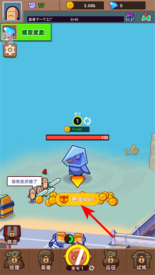 2、游戏中依照箭头指引,点击挑战boss按钮,可触发当前关卡的BOSS战,获取对应的挑战奖励。
