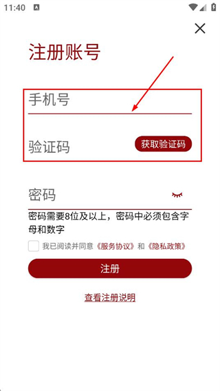 4、在注册帐号页面,输入手机号,点击获取验证码后填写验证码。