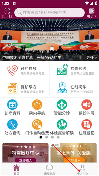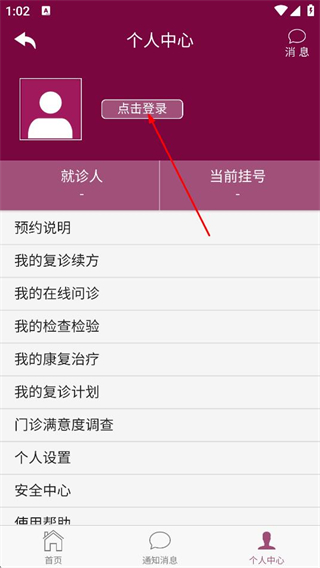1、在医院APP首页,点击底部的个人中心,进入个人中心页面。