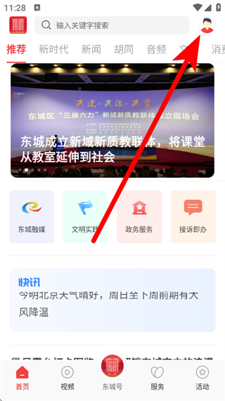 1、打开北京东城,在主界面点击右上角头像,进入我的页面。