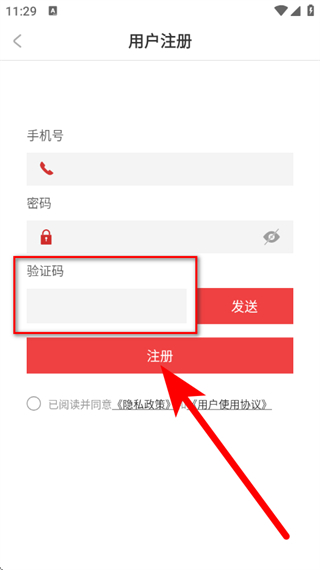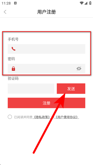 4、在注册页面,输入手机号,设置密码后,点击发送验证码。