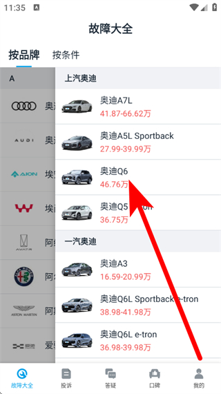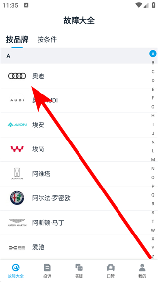 2、在故障大全页面,点击选择奥迪品牌,进入列表。