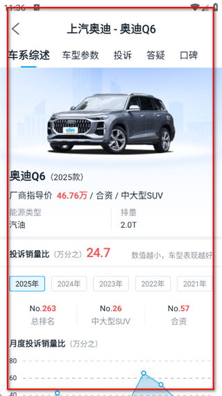 4、在详情页面,查看该车型的投诉销量比、月投诉销量比等投诉相关信息。