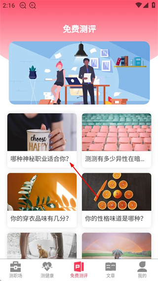 2、在免费测评页面,选择感兴趣的测试,进入测试题目页面。