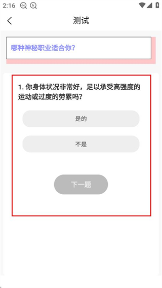 3、在测试页面,选择题目选项后点击下一题按钮,继续完成测试。