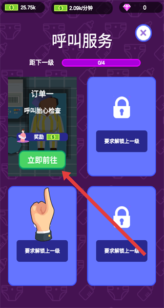 2、在呼叫服务界面,选择对应订单后点击立即前往,进入宝宝检查场景。