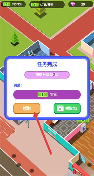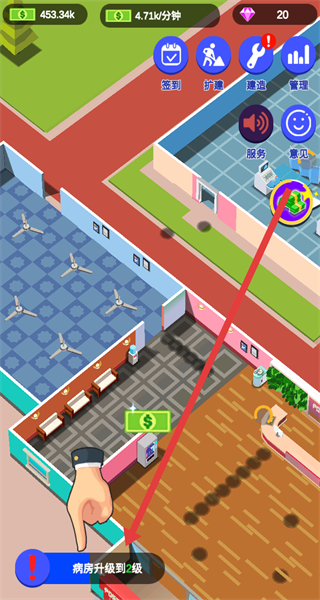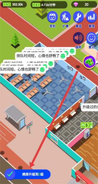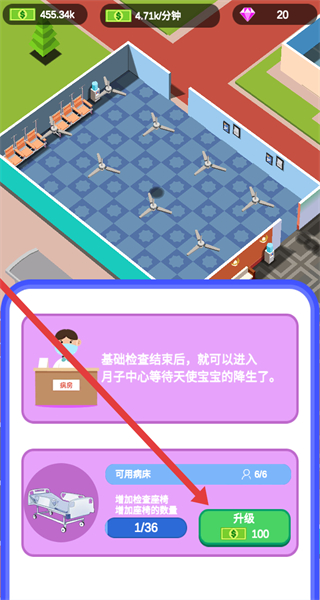 1、在游戏主界面,触发“病房升级到2级”的任务提示后,进入病房操作界面。