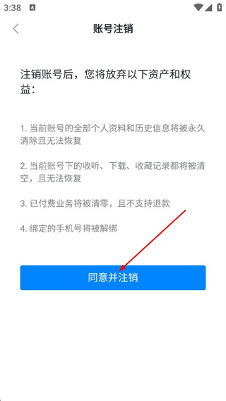 5、在账号注销说明页面,点击同意并注销,进入验证当前手机号页面。