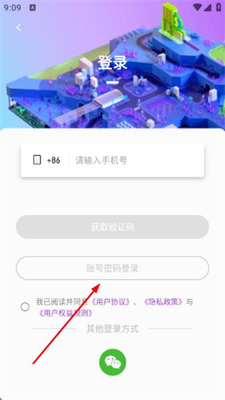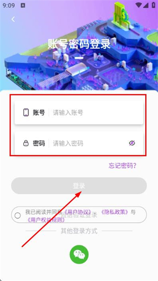 3、在账号密码登录页面填写账号和密码,勾选协议后,点击登录按钮完成账号登录操作。