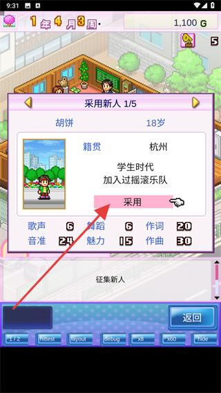 3、在挖掘出的新人中选择一名进行采用,根据下方的新人描述信息进行挑选。