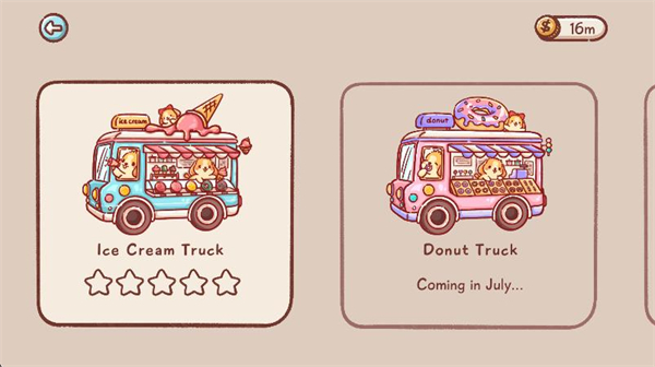 支持餐车全方位升级,从基础制作设备到移动餐车功能,可解锁公园、海滩等不同经营场景;同时能定制餐车外观,利用无限金币打造专属风格的夏日餐车,经营维度丰富且自由。