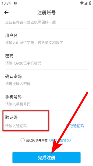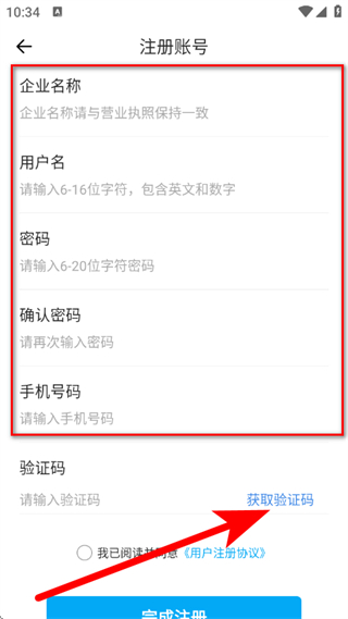 3、在注册账号页面,填写企业名称、手机号码等信息,点击获取验证码。