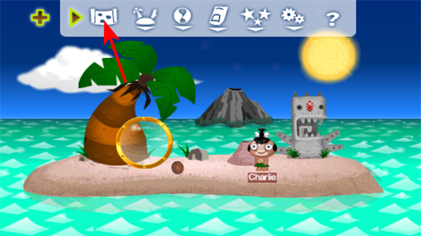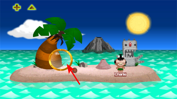1、在岛屿场景中,点击放大镜标识的区域,触发场景内的交互操作,解锁功能菜单,探索做准备。