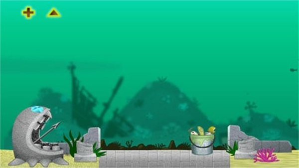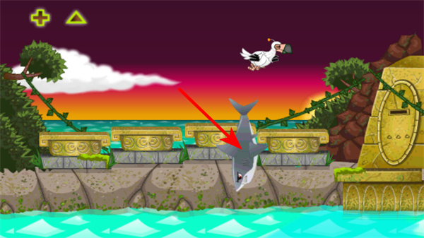 4、观察场景中的危险元素如鲨鱼,结合场景内的平台,规划移动路线以避开危险,推进交互任务。