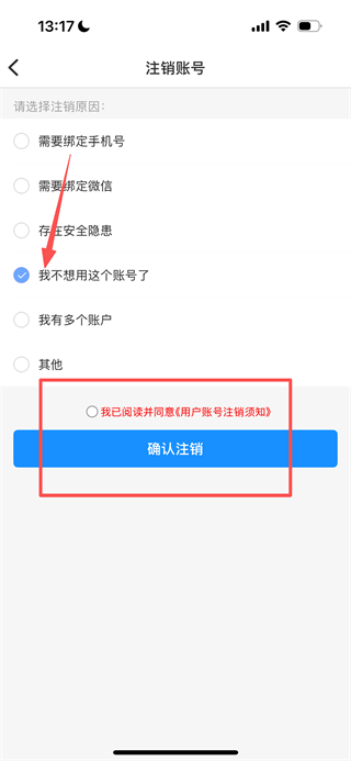 4、在注销账号页面,选择注销原因并勾选协议后,点击确认注销完成操作。