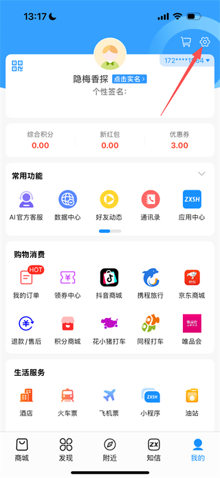1、在知信生活首页,点击底部的我的选项,进入个人中心页面。