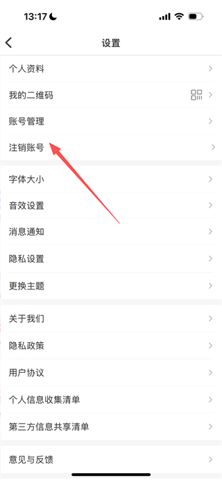 3、在设置页面,点击注销账号选项,进入注销账号页面。