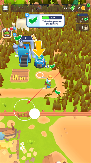 1、通过滑动屏幕任意区域控制角色进行移动,收割农场内的稻草进行收集。