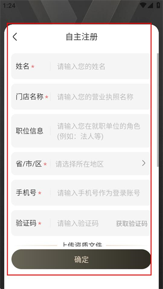 3、在自主注册页面,填写信息后点击确定完成注册。