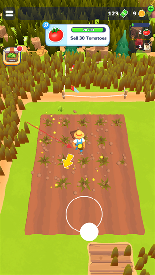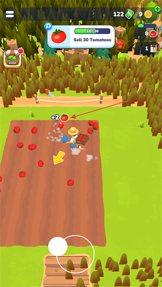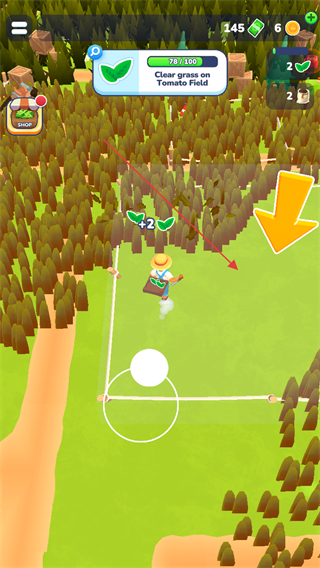 1、通过移动轮盘控制角色移动到新的农田地皮区域,清理出需要的地皮区域进行解锁。