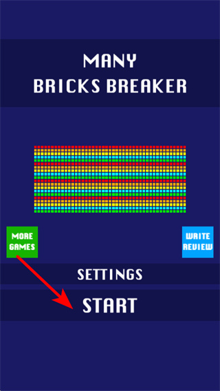 1、在游戏的启动界面里,点击START按钮,进入砖块消除关卡的实际操作场景,开启消除砖块的核心玩法挑战。