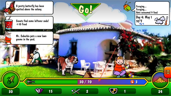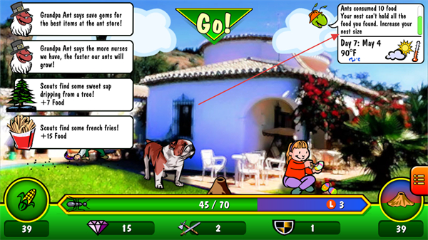 1、查看场景提示,点击Go!推进进程,进度升至30/70,同时消耗食物。