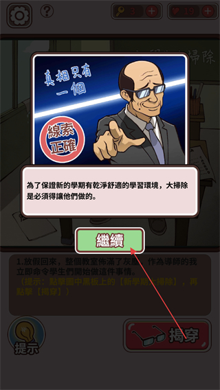 3、点击揭穿按钮,指出李董谎称功课本丢失的行为。