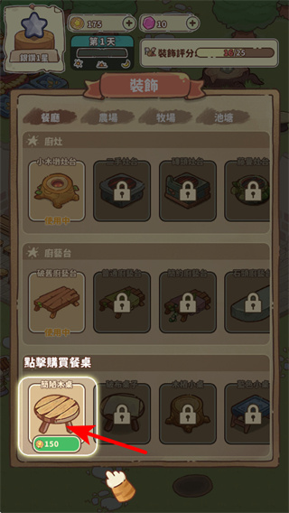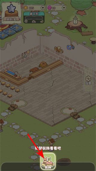 2、建筑搭建完成后,点击底部的装饰按钮进入装饰界面,查看可解锁的装饰道具,需求挑选装饰来美化区域。