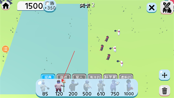 3、点击上方蓝色的方块区域将购买的小人放入其中进行布阵,直到把当前关卡的经费全部用完为止。