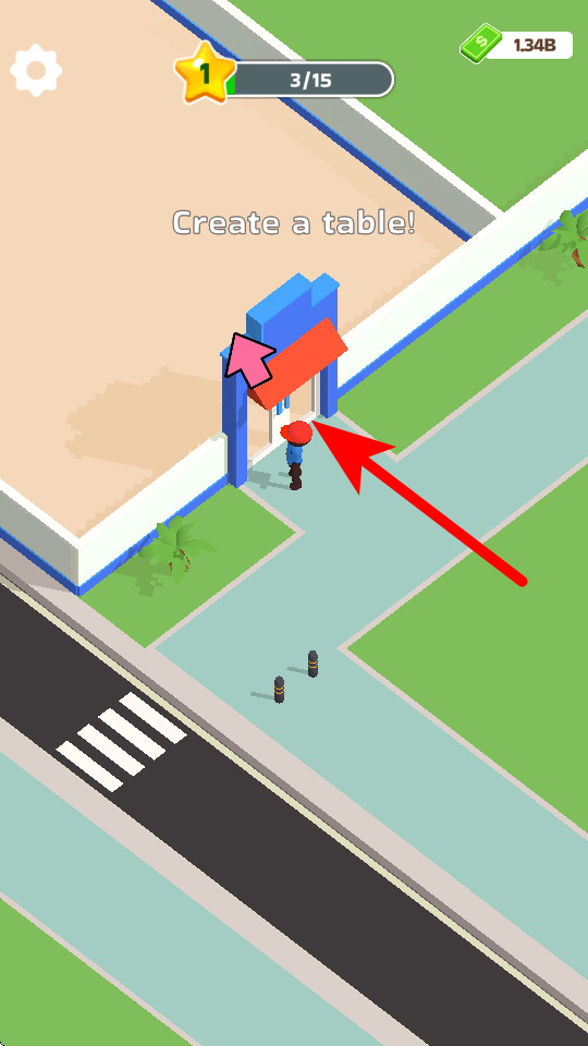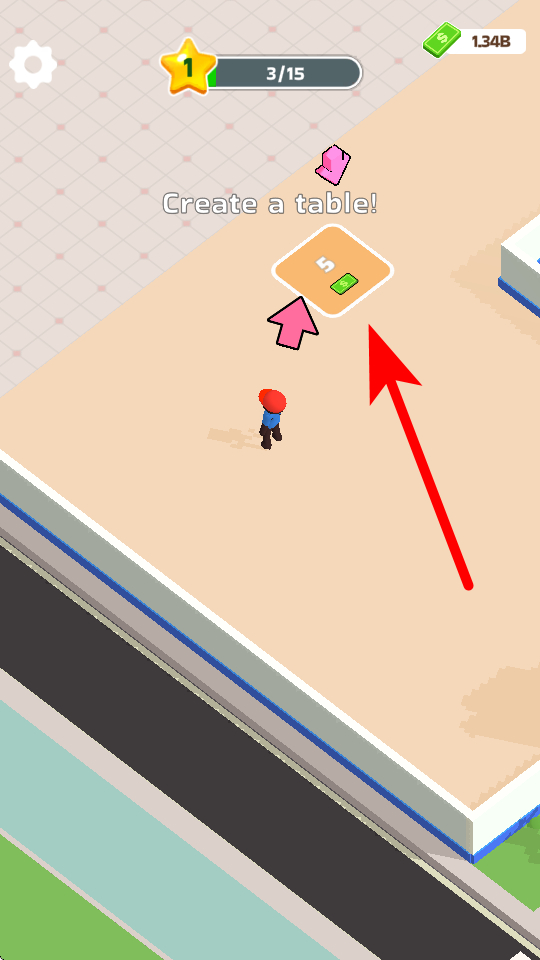 1、根据界面提示点击箭头指引的建筑区域,进入设施升级操作界面,这是开启店铺设施升级的关键操作,进入后可解锁桌子等基础经营设施,为后续升级铺垫基础。