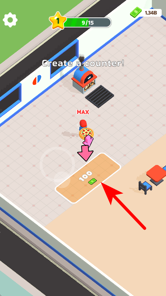 3、当出现界面提示,点击箭头指引的柜台建造区域,消耗资源解锁柜台设施,这是升级店铺服务能力的关键步骤,柜台可提升出餐效率,助力店铺等级的提升进程。