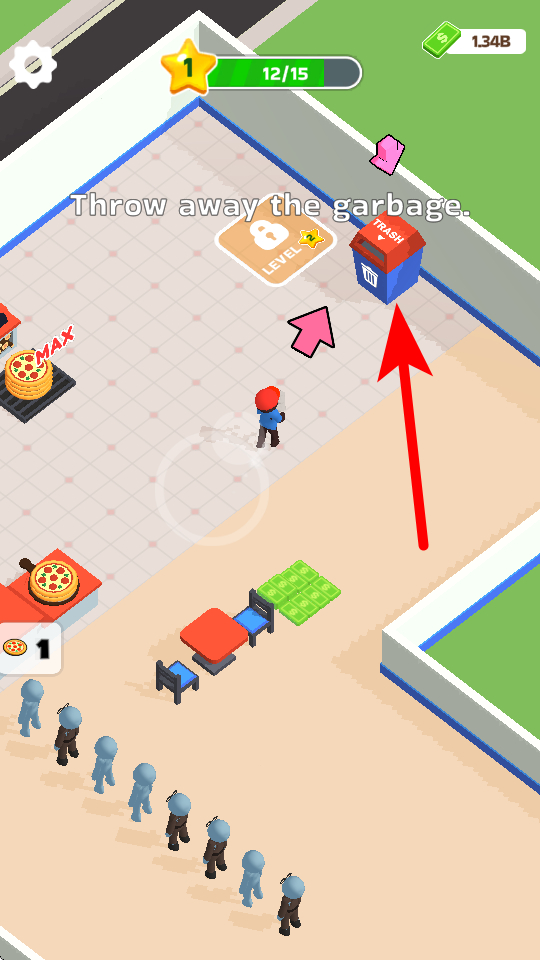 4、当界面提示Throw away the garbage时,玩家需要操控角色移动到垃圾桶处处理垃圾,完成后可以解锁新的等级进度,完成日常事务能积累升级所需的进度值。