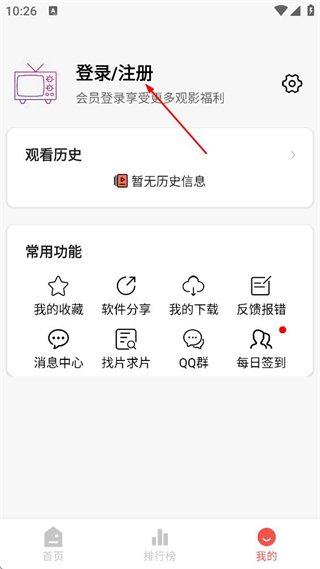 2、在我的页面,点击登录/注册区域,进入登录界面。