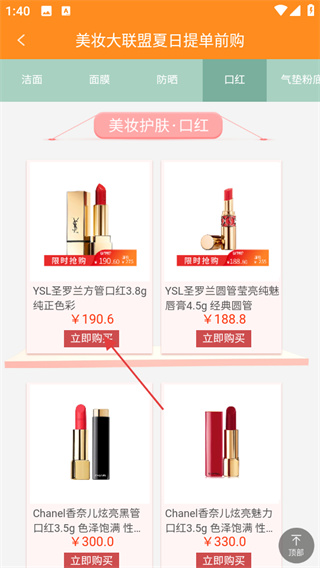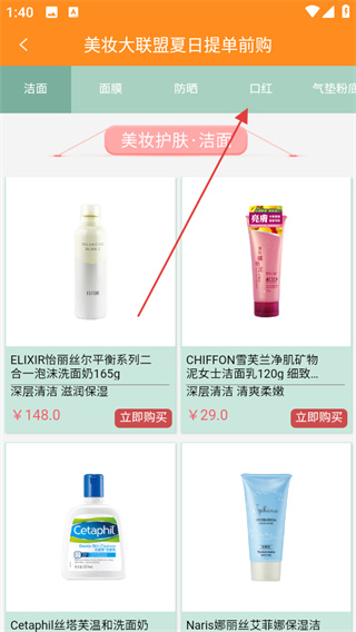 2、在美妆护肤页面,点击口红标签,切换至口红商品列表页。