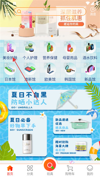 1、在盈橙的首页,点击美妆护肤分类,进入美妆护肤页面。
