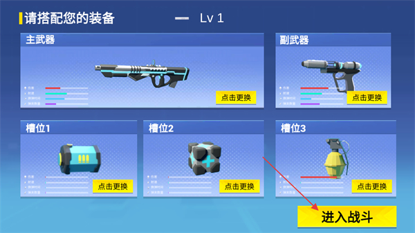 2、进入游戏对局前需要先搭配装备,点击装备上的更换按钮可以换更强力的武器进行装备,点击进入战斗按钮开始对局。