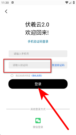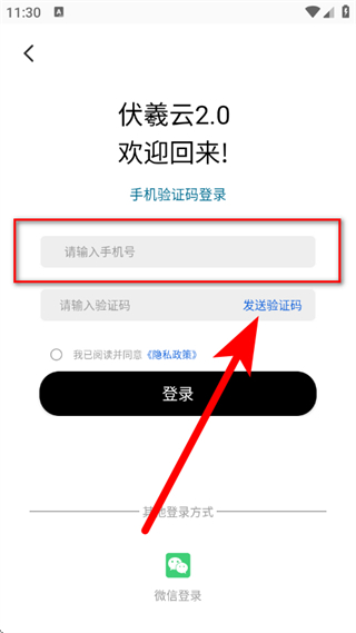 3、在伏羲云登录页面,输入手机号,点击发送验证码。