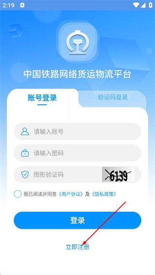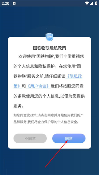 1、在国铁物联的隐私政策弹窗中,点击同意按钮,进入账号登录页面。