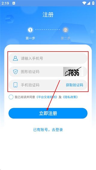 2、在账号登录页面,点击下方的立即注册选项,进入注册第一步页面。