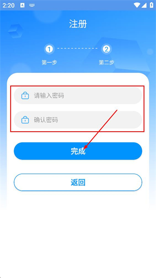 4、可填写密码并确认密码,点击完成按钮,完成国铁物联的账号注册操作。