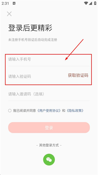 2、在登录后更精彩页面,填写手机号,点击后填写收到的验证码。