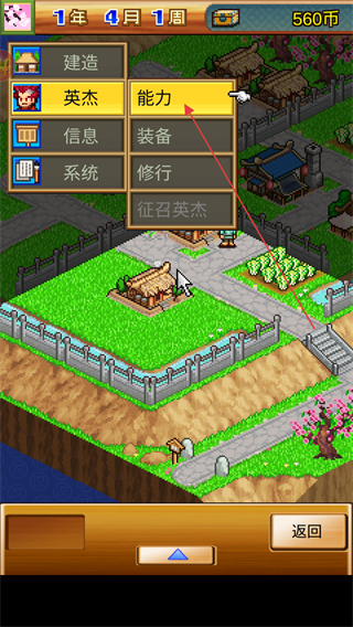 2、在菜单栏列表中点击英杰选项点击能力按钮,查看当前村落中的英杰信息。