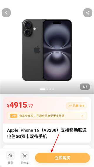 3、在商品详情页,点击立即购买按钮,可完成该商品的购买流程。