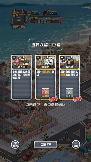 1、进入末日生存模式,每日可以选择收留一位幸存者加入,根据下方描述进行选择。