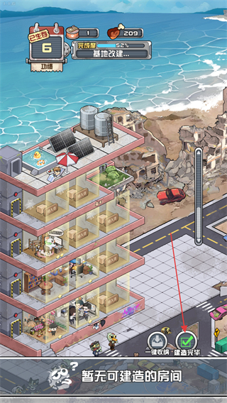 2、点击下方安全按钮进入建造页面,拖动下方可以建造的房屋放置在出租屋楼内进行建设。