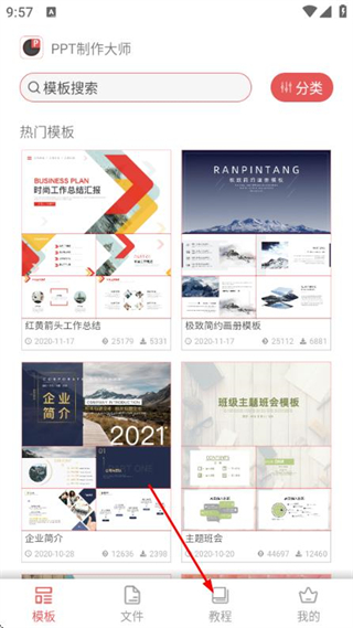 1、在PPT制作大师首页点击底部的教程选项,进入教程页面。