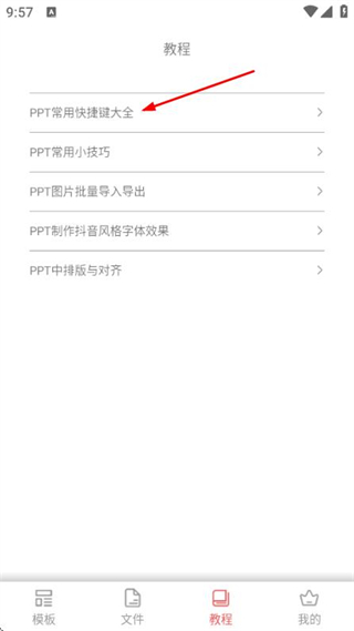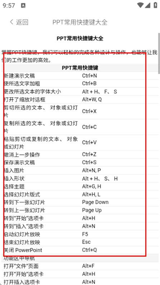 3、在详情页面查看PPT常用快捷键的内容,学习PPT操作的快捷方式。