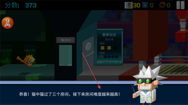 3、通过三个房间后,收到提示房间难度提升,分数变为373。