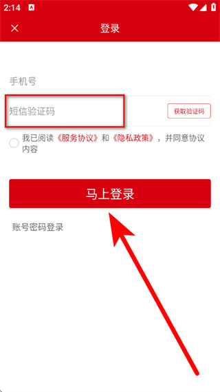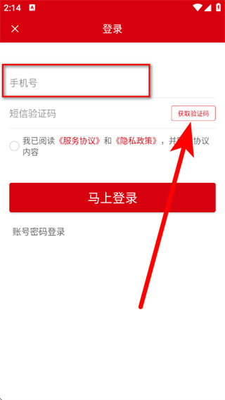 3、在登录页面,输入手机号,点击获取验证码。