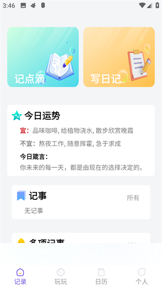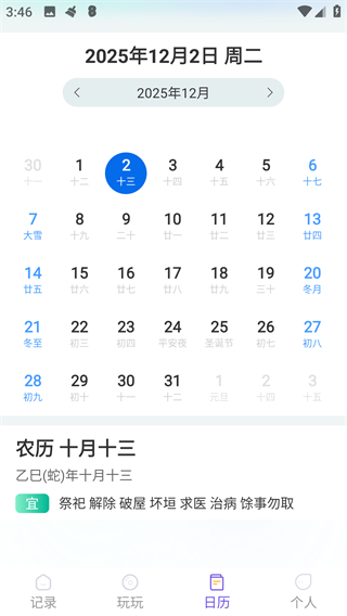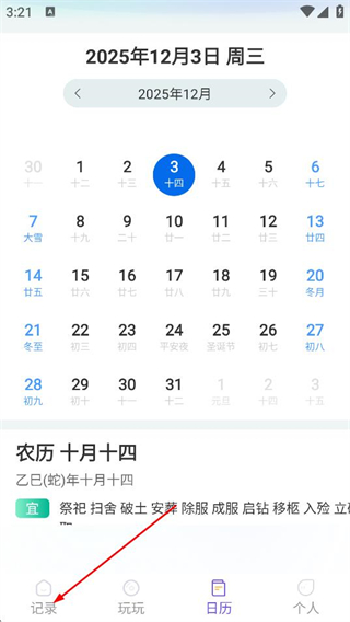 1、在日历页面,点击底部导航栏的记录,进入记录功能页面。